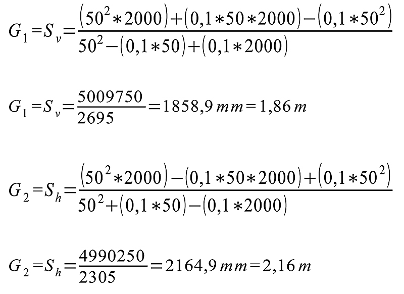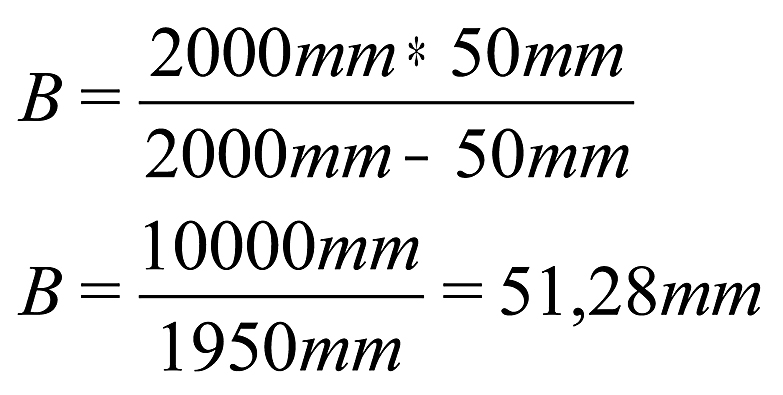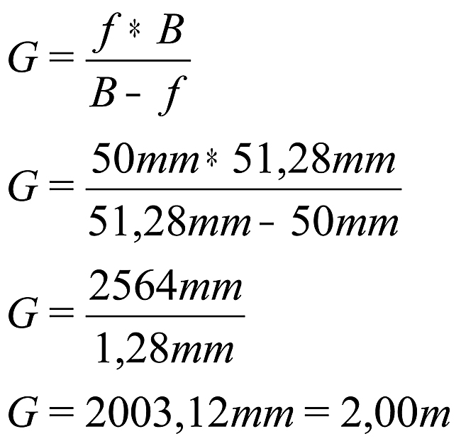 Für eine Situation in der das Objektiv mit der Brennweite f = 50 mm auf eine Entfernung G = 2000 mm (gemessen von seiner Vorderseite) eingestellt ist ergibt sich so: