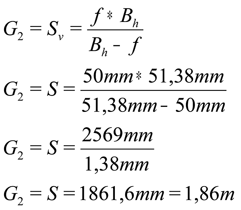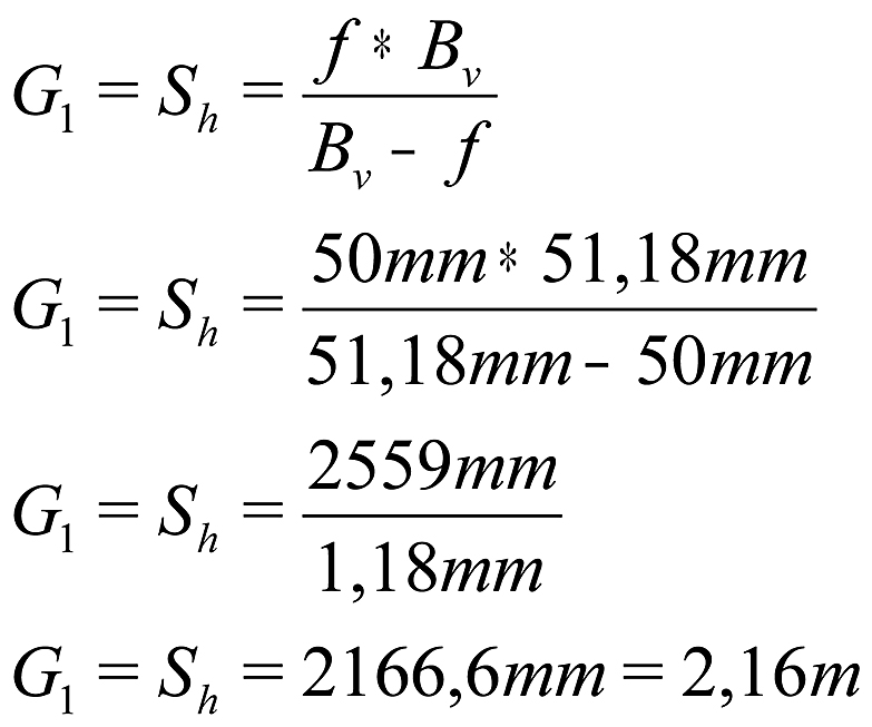 Damit besitzen wir die Werte für die bildseitige Schärfentiefe der Kombination f = 50 mm, f/4, z = 0,025 mm, G = 2000 mm. In Wirklichkeit sind wir aber an der Ausdehnung des scharfen Bereichs auf der Objektseite interessiert. Schließlich wollen wir wissen, welcher Teil unseres Motivs im Bild akzeptabel scharf erscheinen wird. Um ihn zu ermitteln, projizieren wir die Punkte Bv und Bh auf diese andere Seite. Dies sind die Punkte Sv und Sh in Abb. 2. Die Linsenformel gibt uns nach einer anderen Umstellung die Möglichkeit dazu, denn sie setzt ja Bildweite B, Gegenstandsweite G und Brennweite f in eine Beziehung zueinander:
